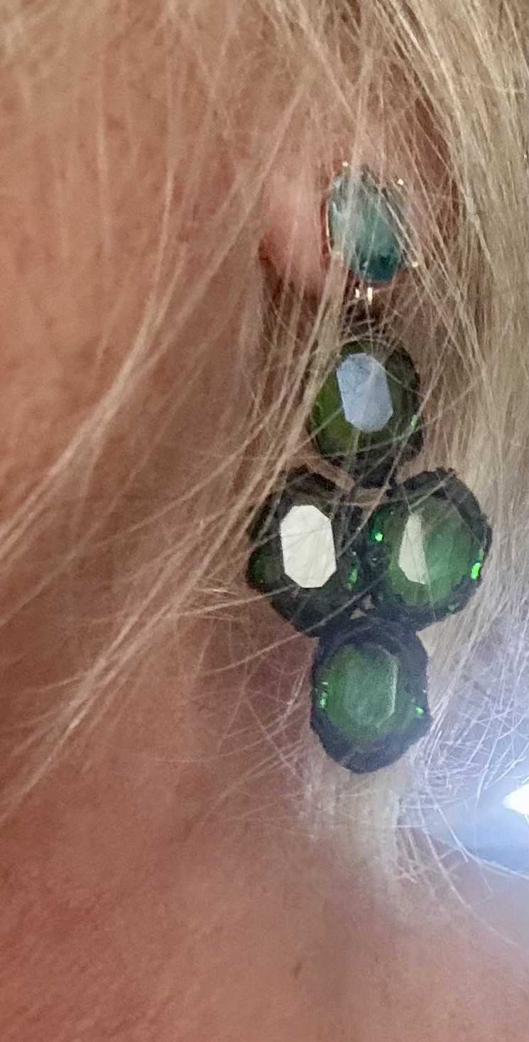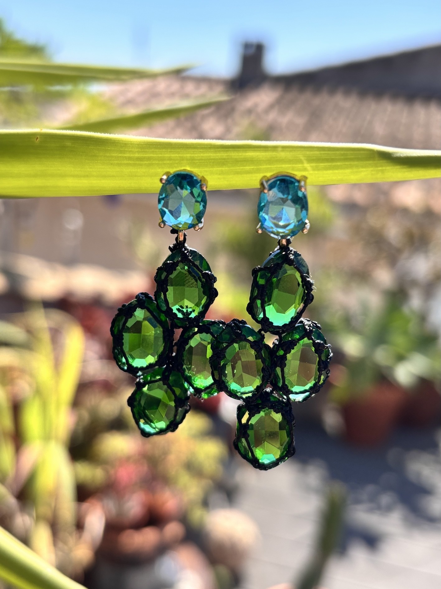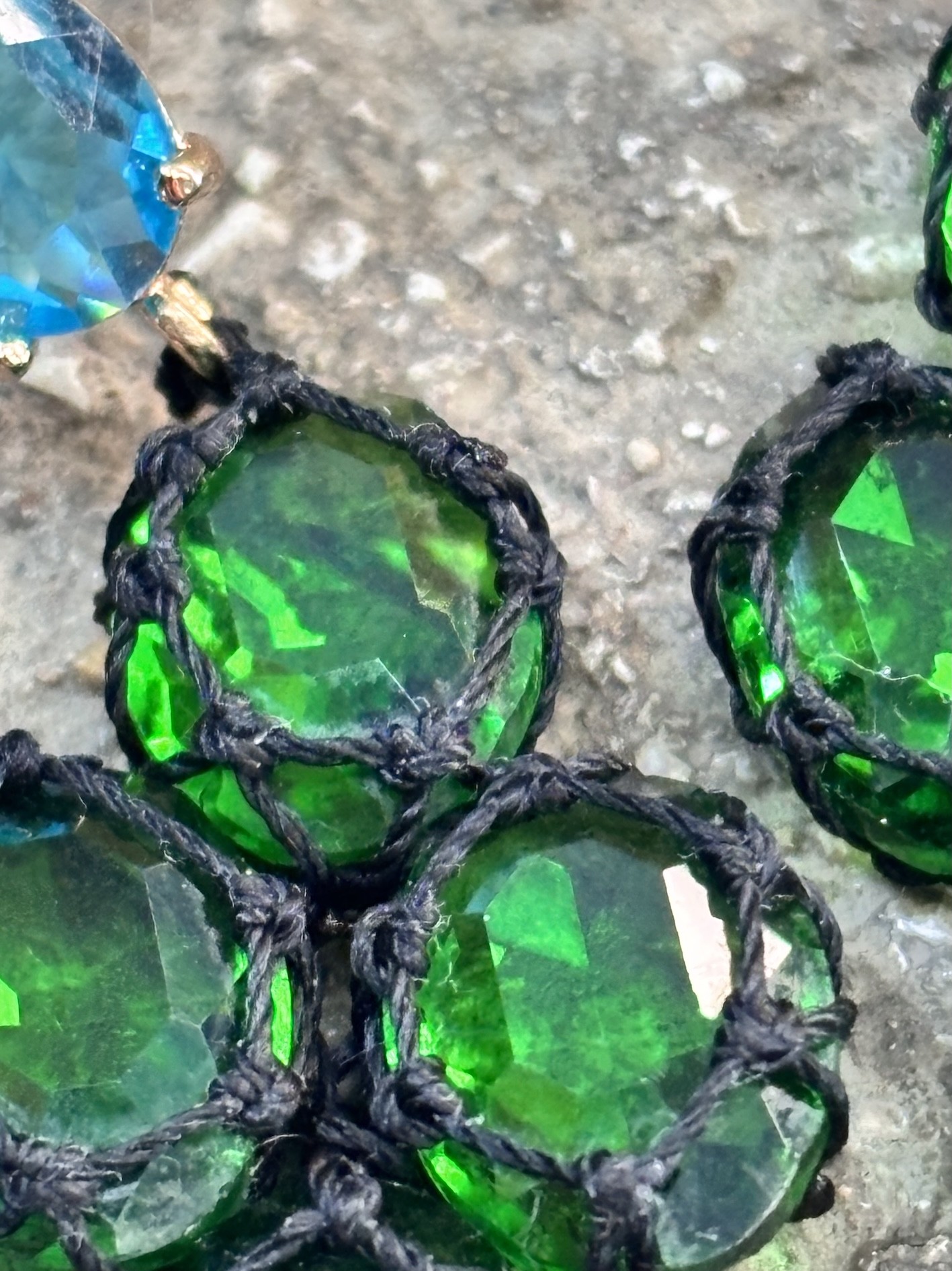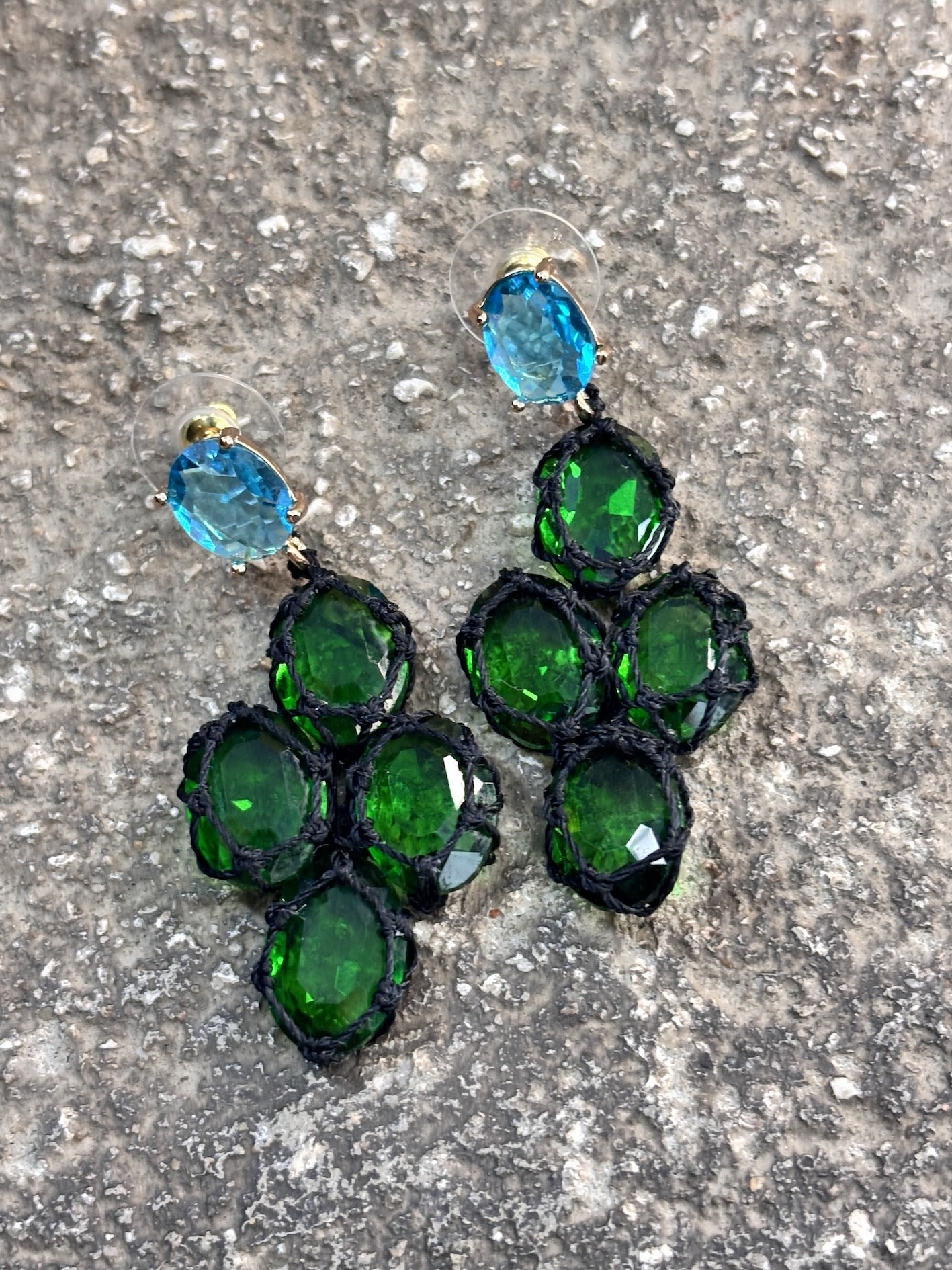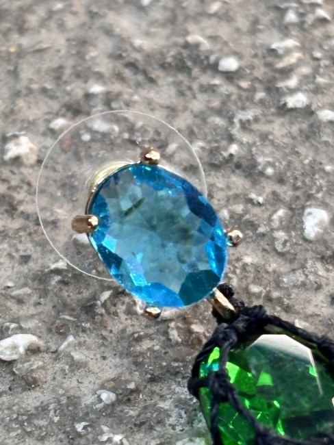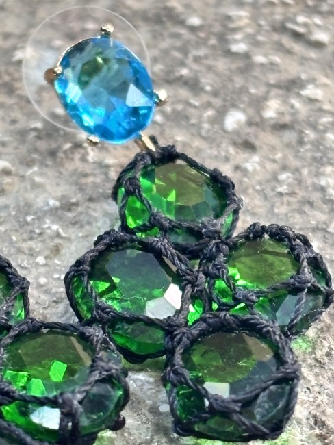 ✨ Ces boucles sont composées de pierres de synthèse facettées (taille 10x14 mm) dignes d’un travail de lapidaire, tressées une à une avec un fil noir mat de 0,35 mm.