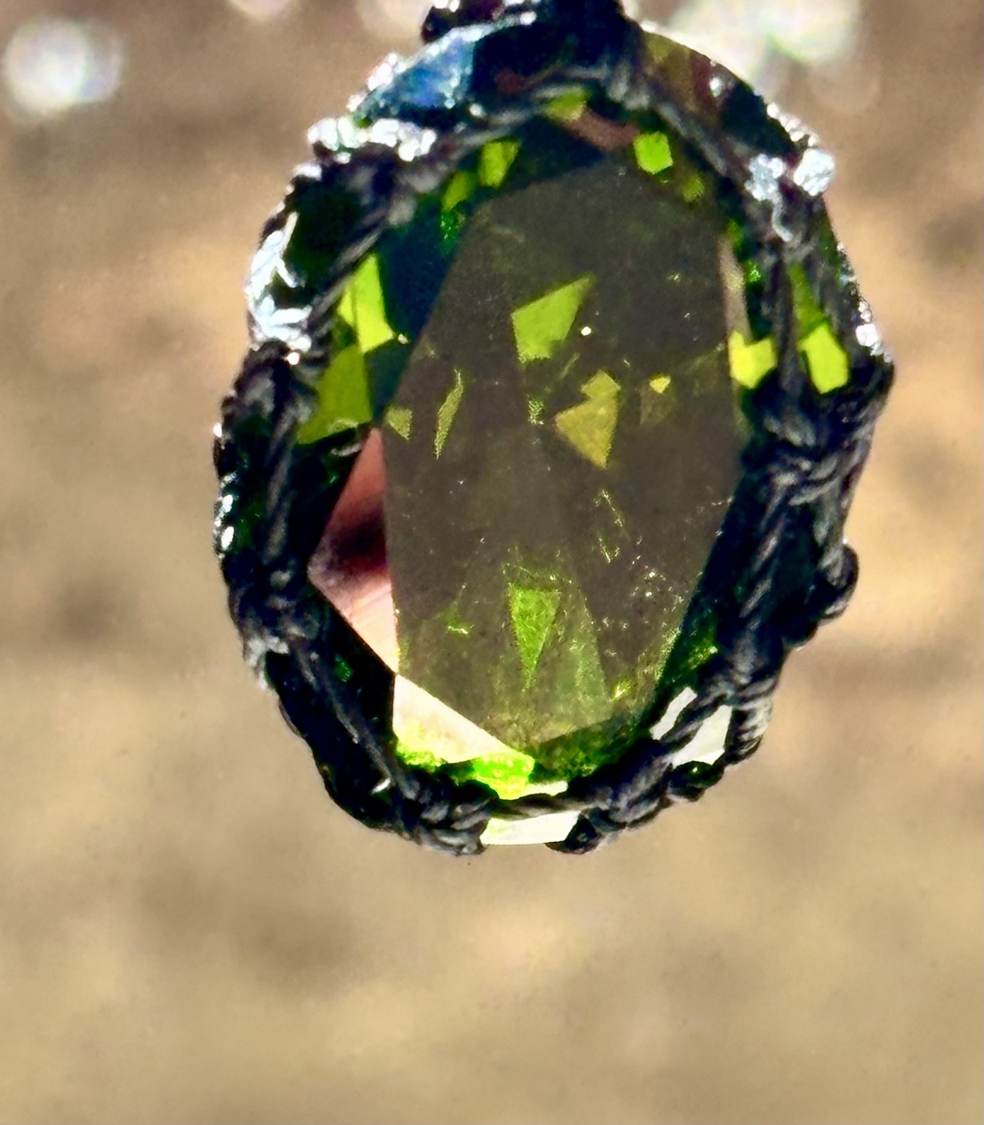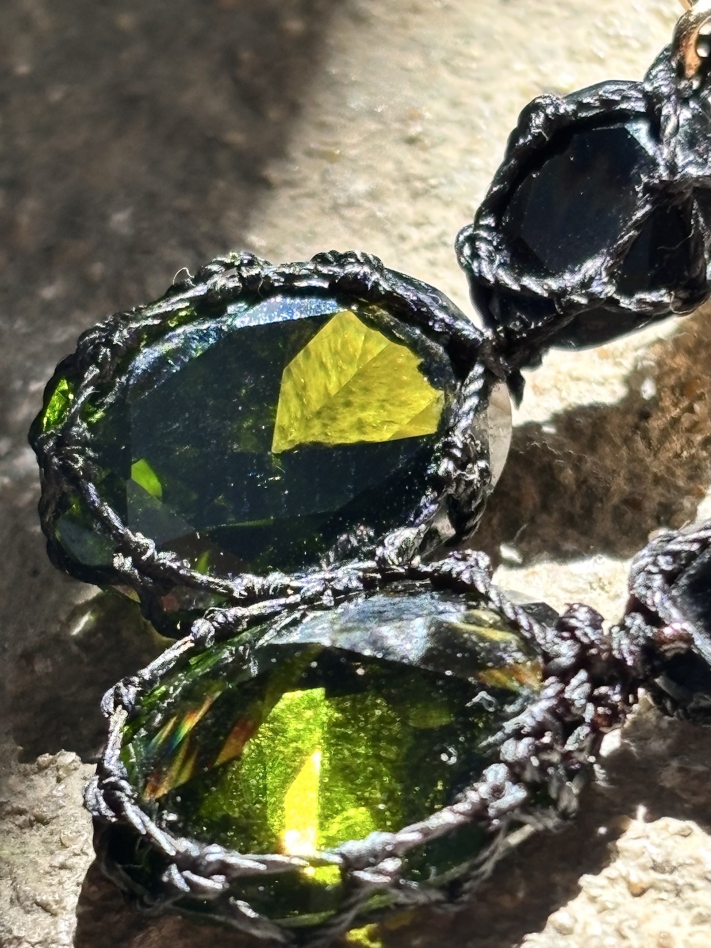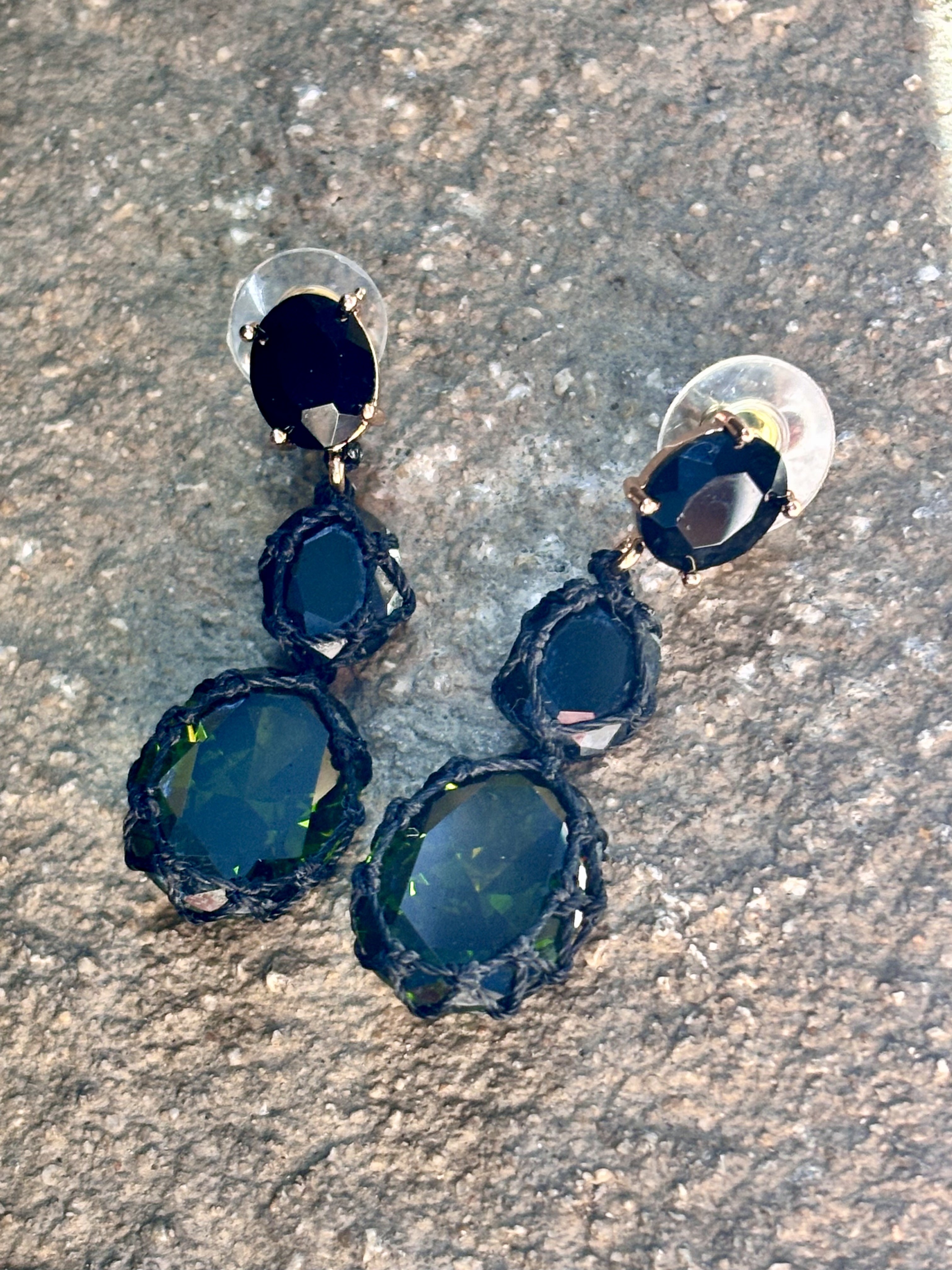 Énigmatiques, sensuelles, presque hypnotiques… Les boucles d’oreilles Belladone jouent avec la lumière comme avec les regards. Leur secret ? Un somptueux zircon cubique facetté vert intense (13x18 mm), serti à la main avec un fil noir mat, et accompagné d’une spinelle noire plus discrète mais tout aussi précieuse.