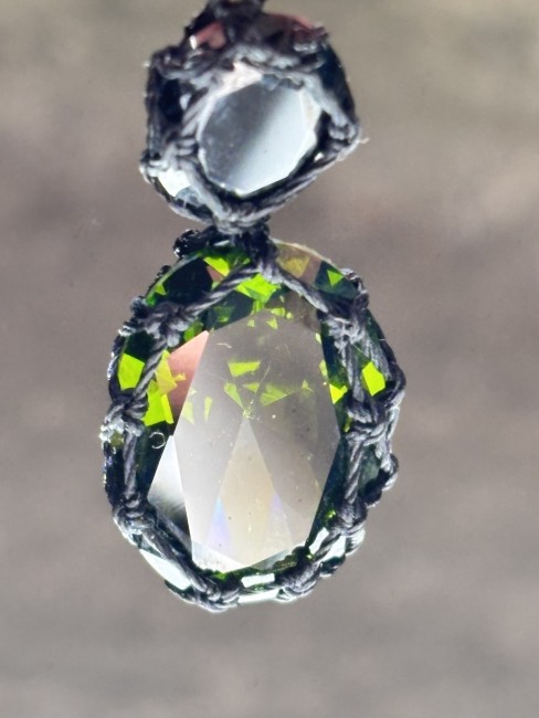 Le tout est suspendu à un fermoir clou en cristal noir facetté, monté sur une structure en plaqué or, pour une touche d’élégance nocturne.