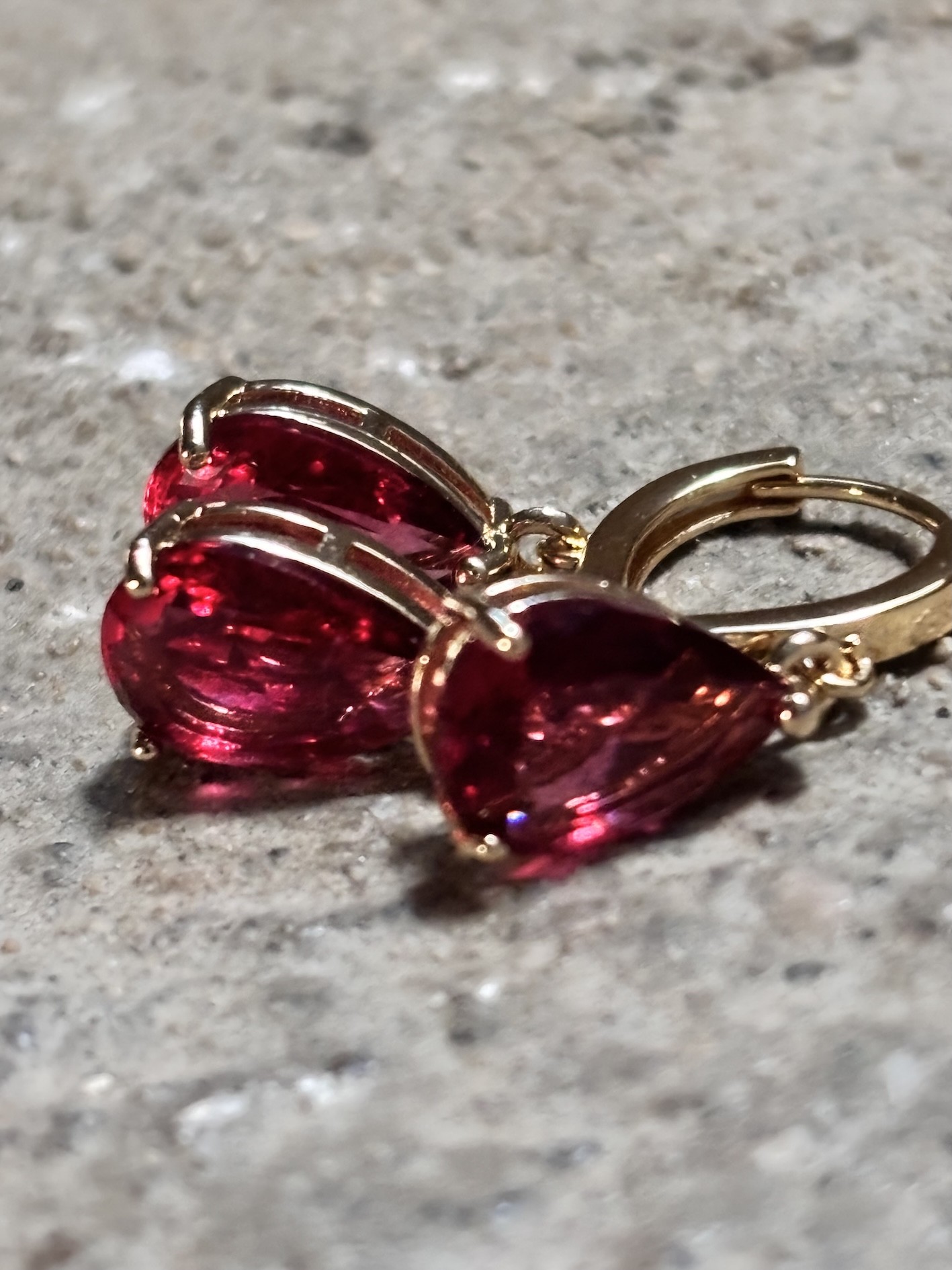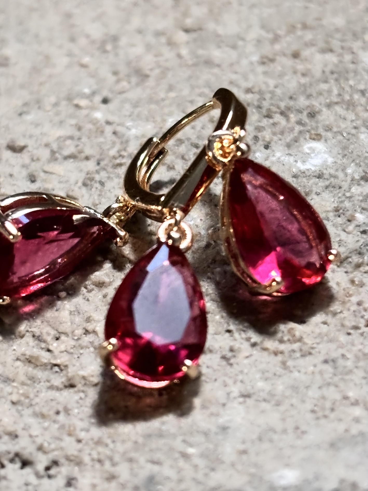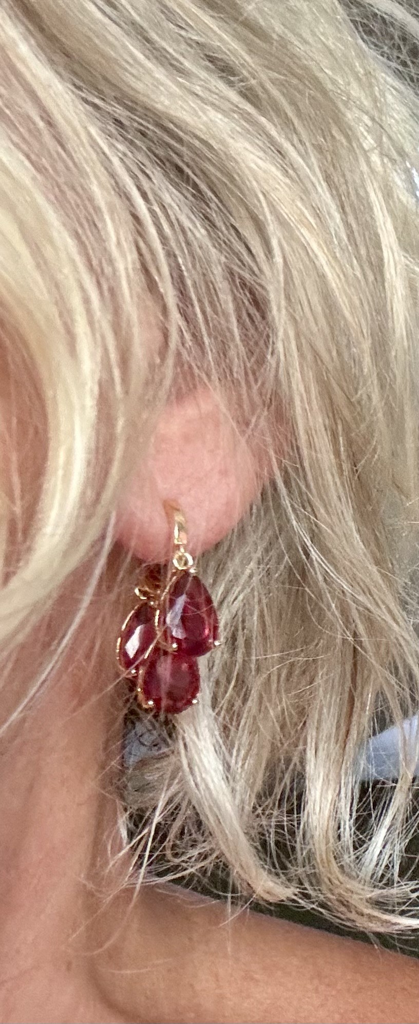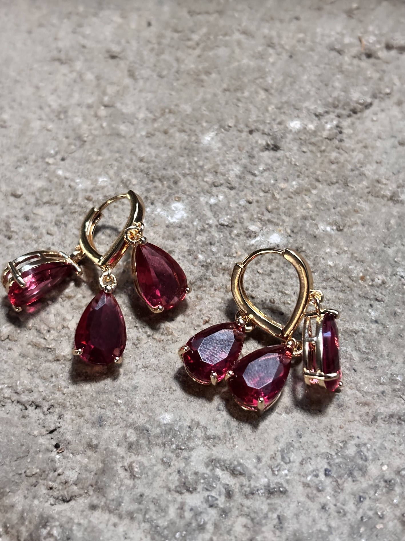 Cette paire de boucles est composée de trois rubis cristal superbement taillés, montés sur une structure plaquée or 18k, pour un rendu éclatant et vibrant à chaque mouvement.