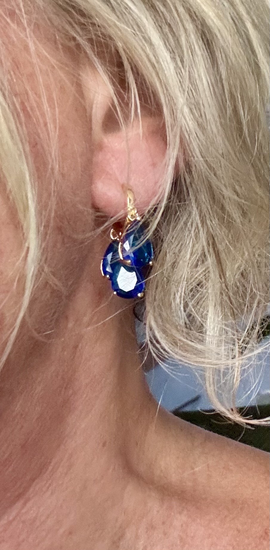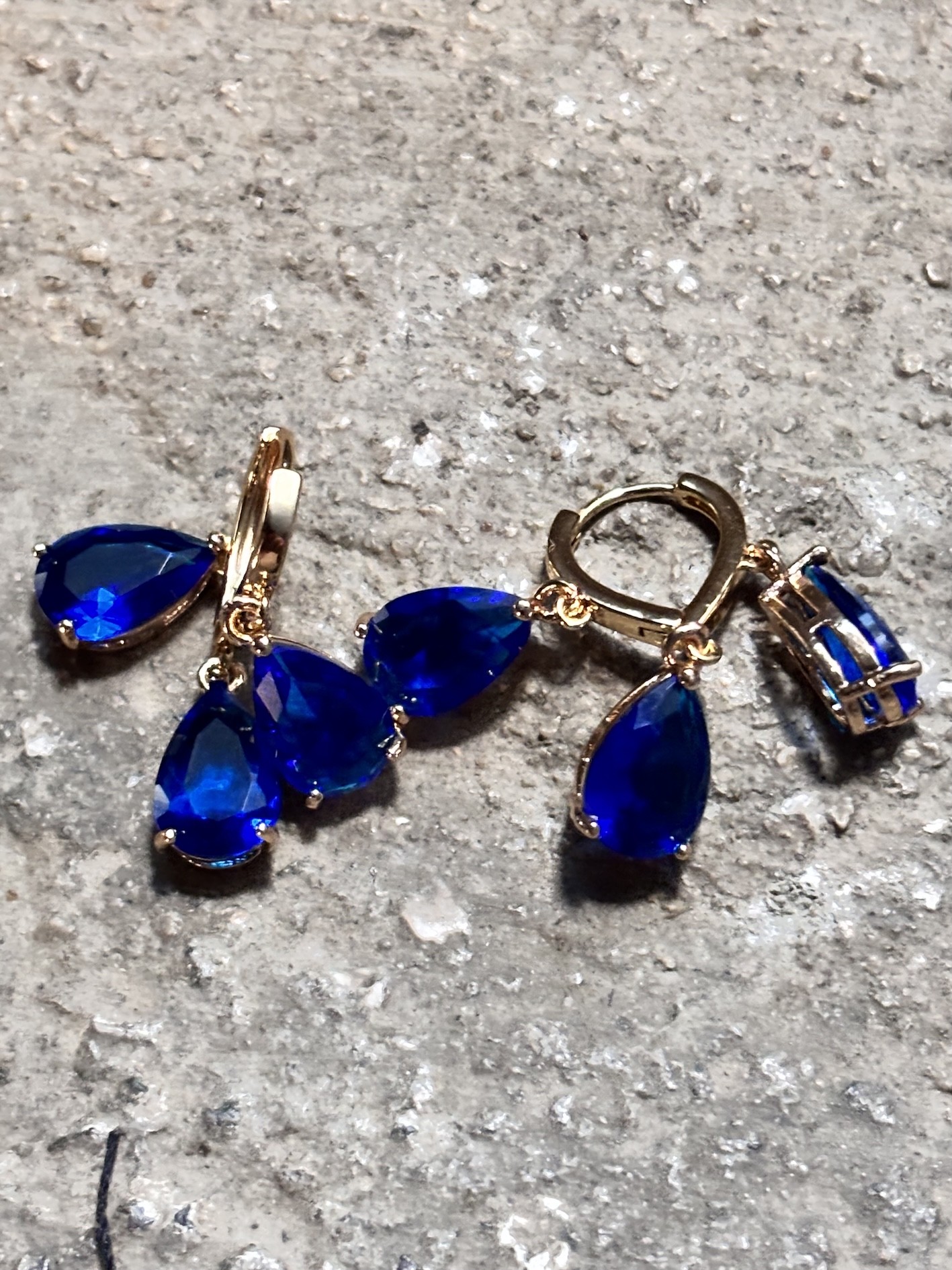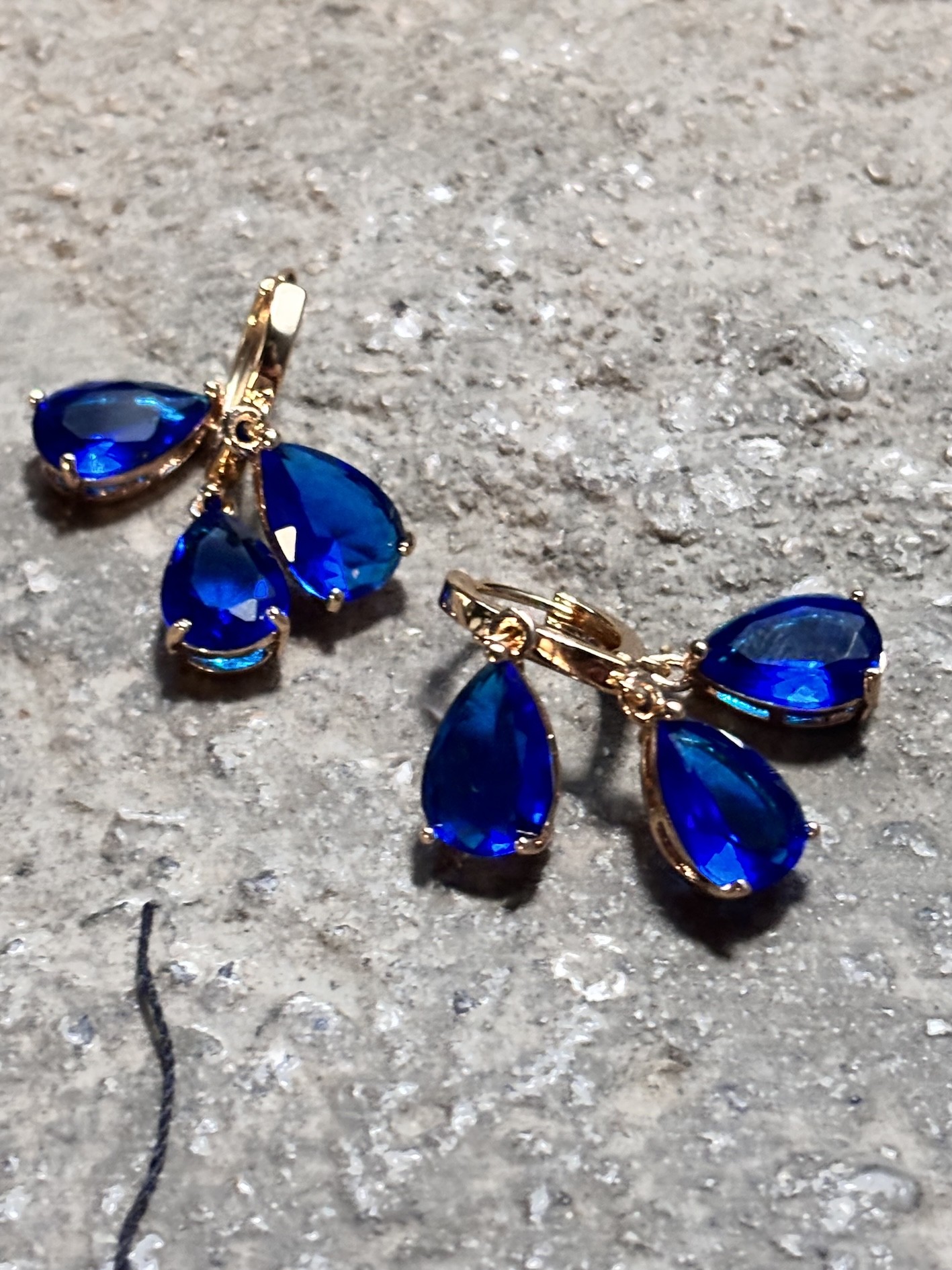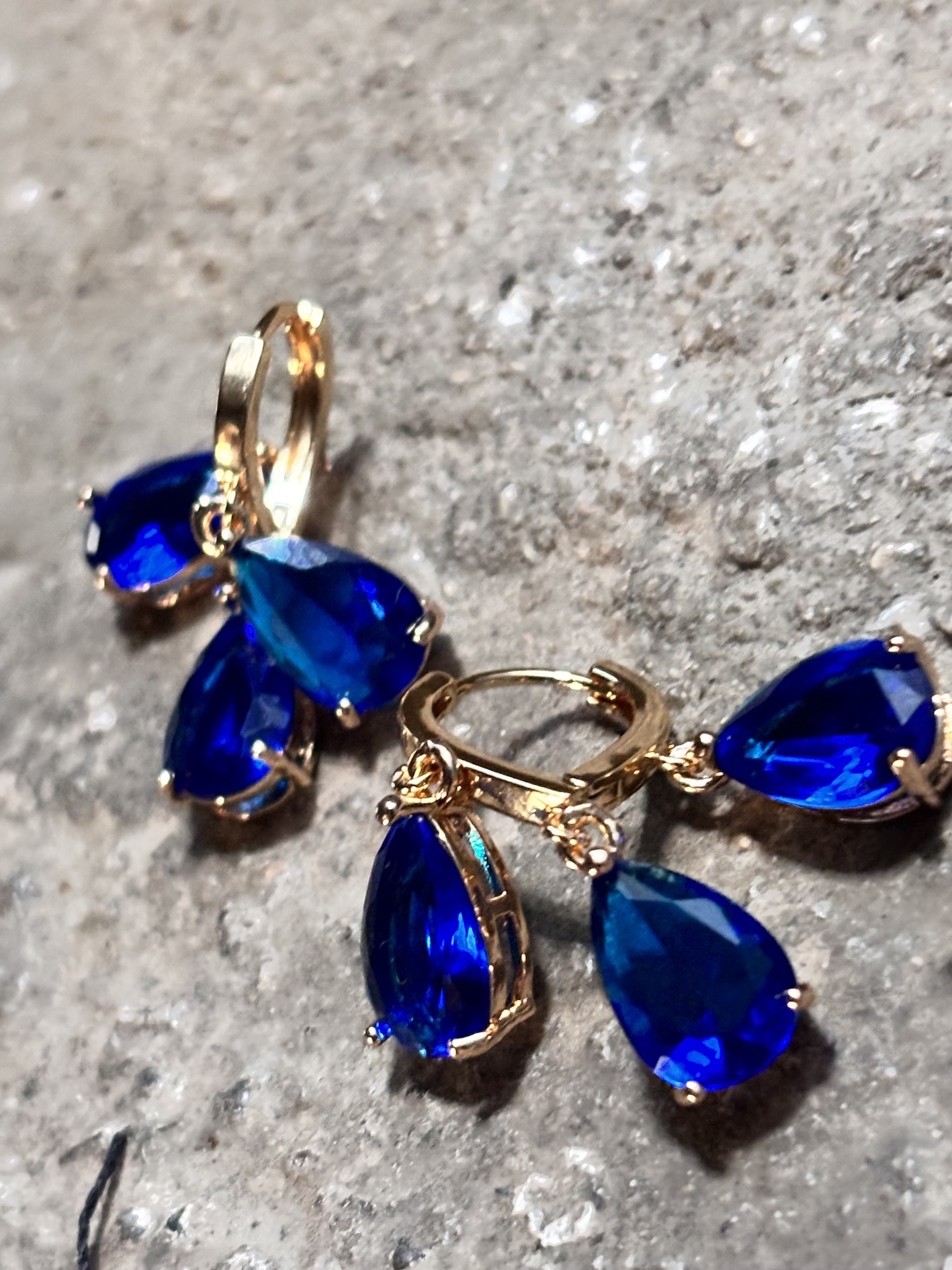 Trois pierres façon saphir, taille goutte, montées en trio sur une structure plaquée or 18k, viennent jouer la lumière comme des éclats d’océan sous projecteurs.