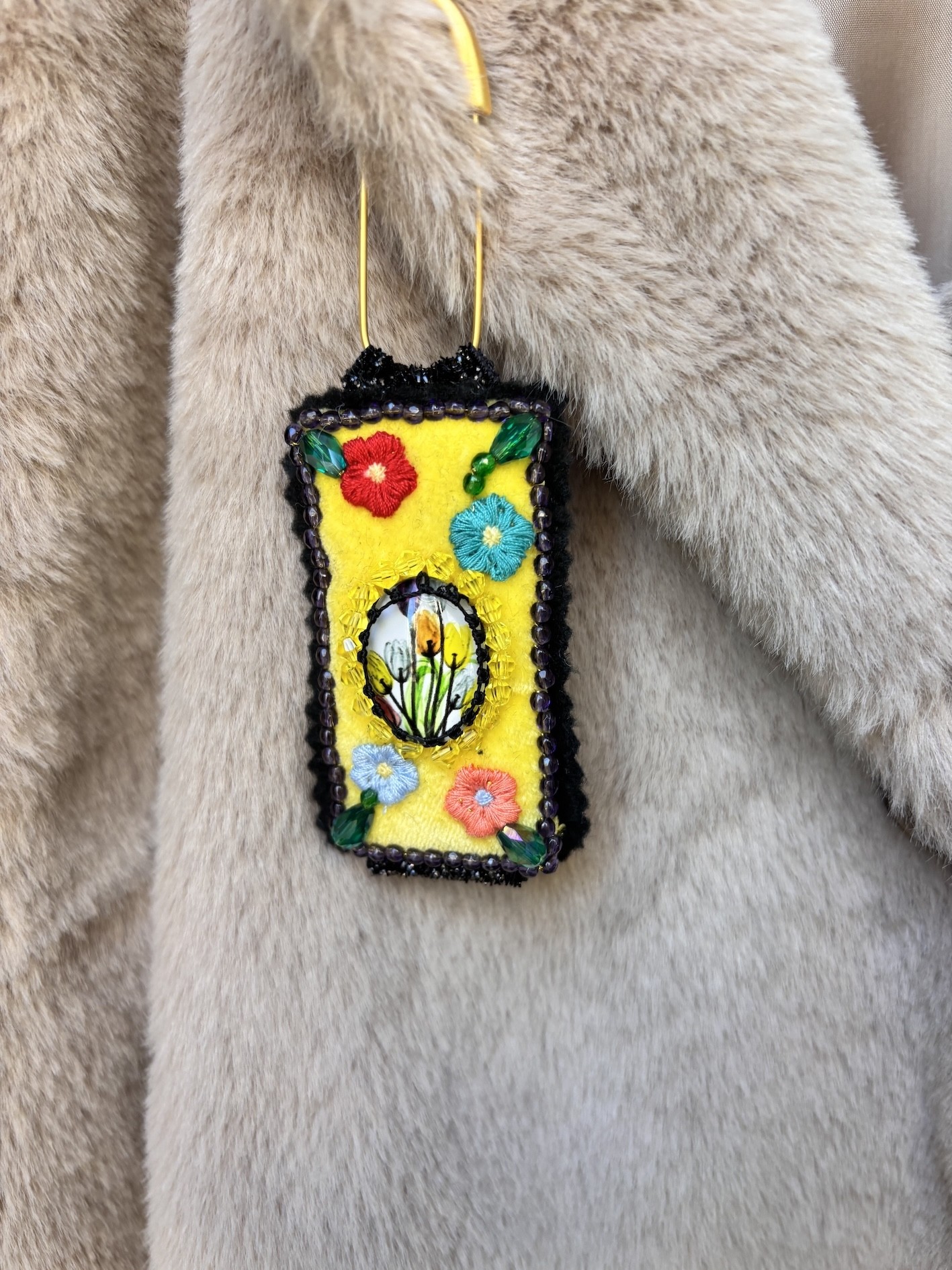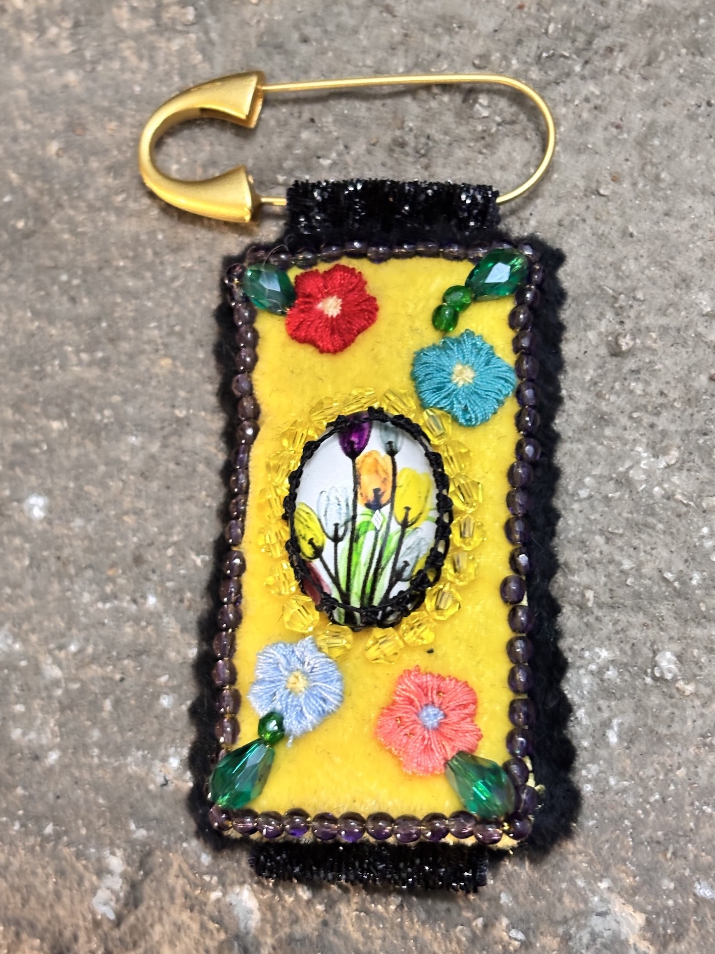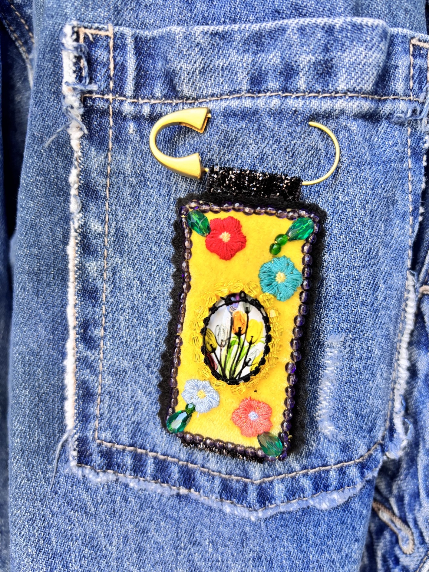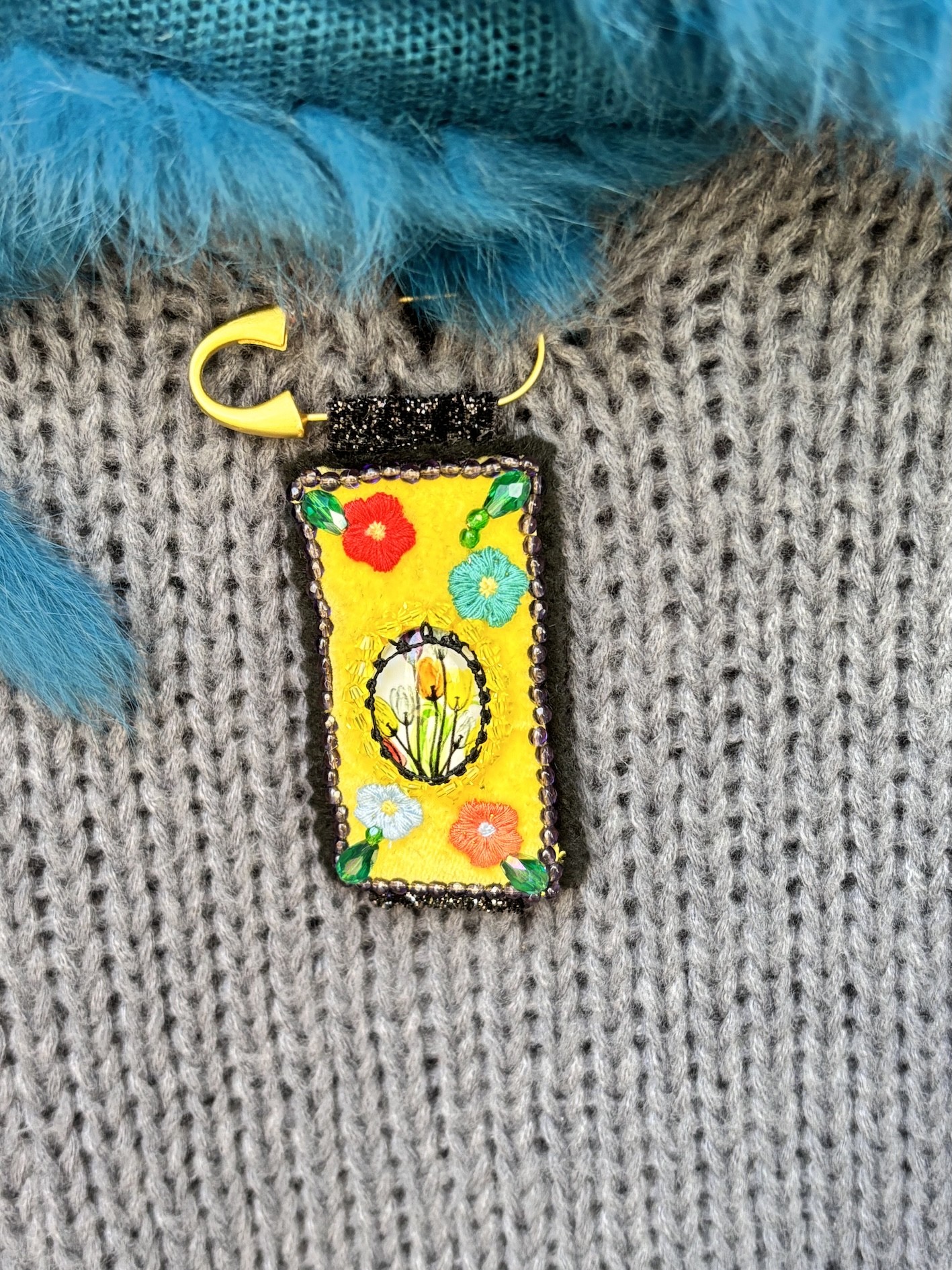 Cette broche, c’est le charme d’un bouquet un peu surréaliste cousu sur un rectangle de 6 cm, encadré de glitter noir (oui oui, on aime le contraste !), le tout suspendu à une épingle dorée de 5 cm.