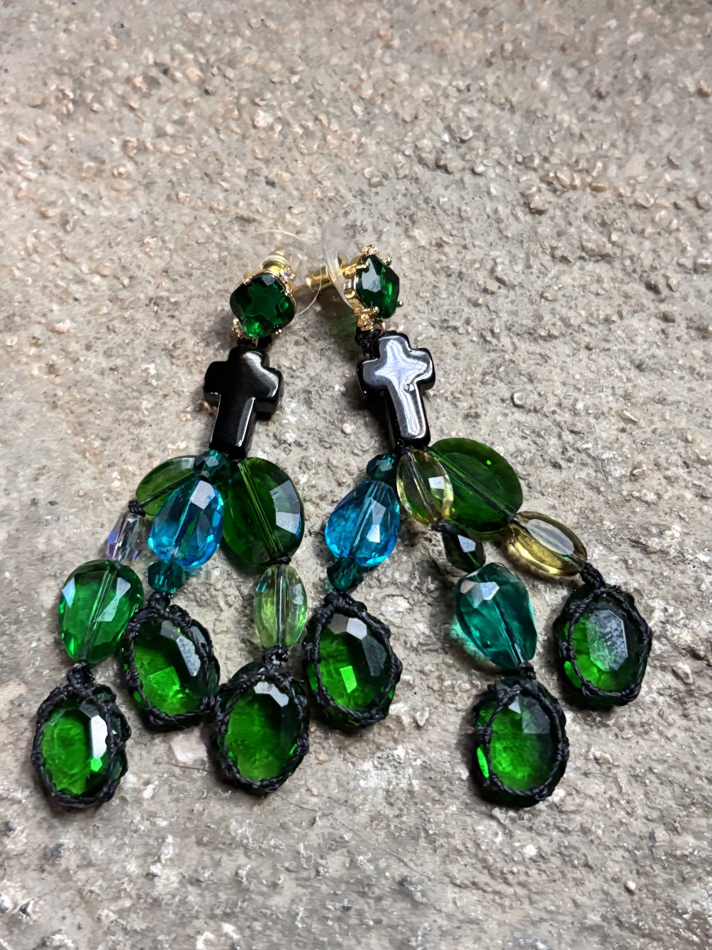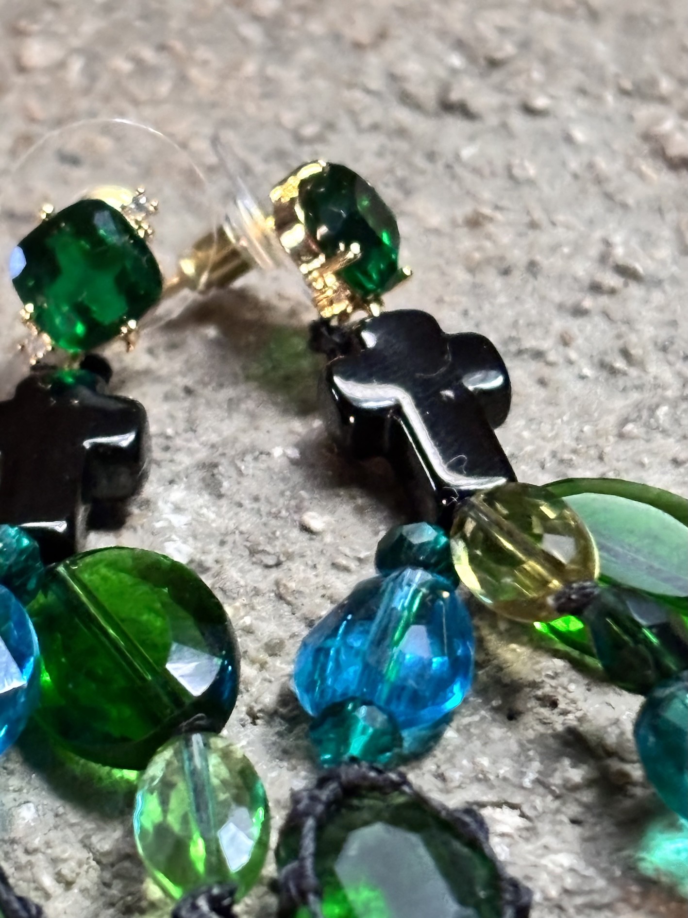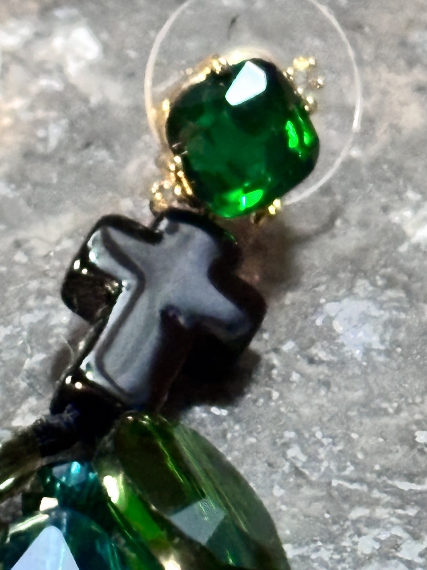 Boucles d’oreilles composées d’un fermoir cristal vert monté sur structure plaqué or 18k 💚, d’une croix métallique noire effet miroir 🖤 et de trois pendants mêlant pierres lapidaires & perles tchèques facettées 🔥.