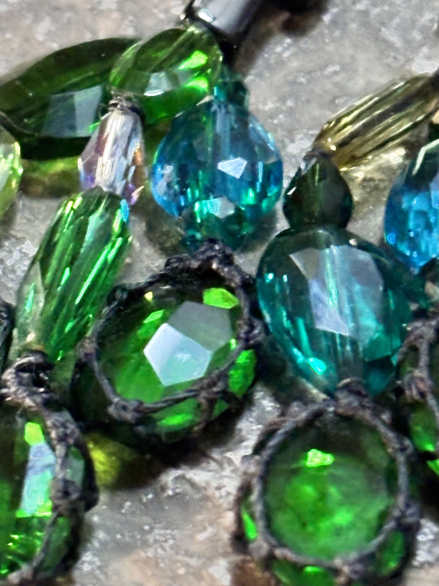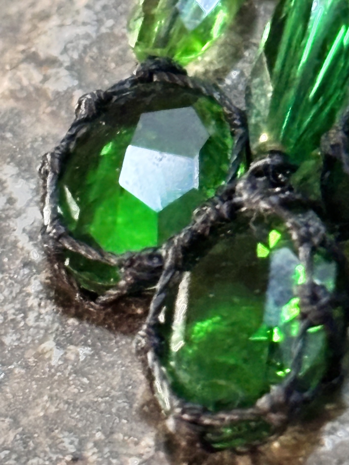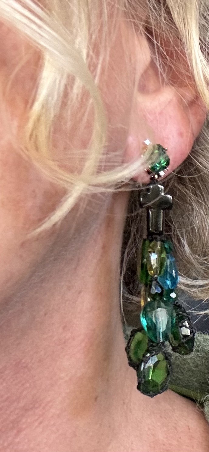 Boucles d’oreilles composées d’un fermoir cristal vert monté sur structure plaqué or 18k 💚, d’une croix métallique noire effet miroir 🖤 et de trois pendants mêlant pierres lapidaires & perles tchèques facettées 🔥.