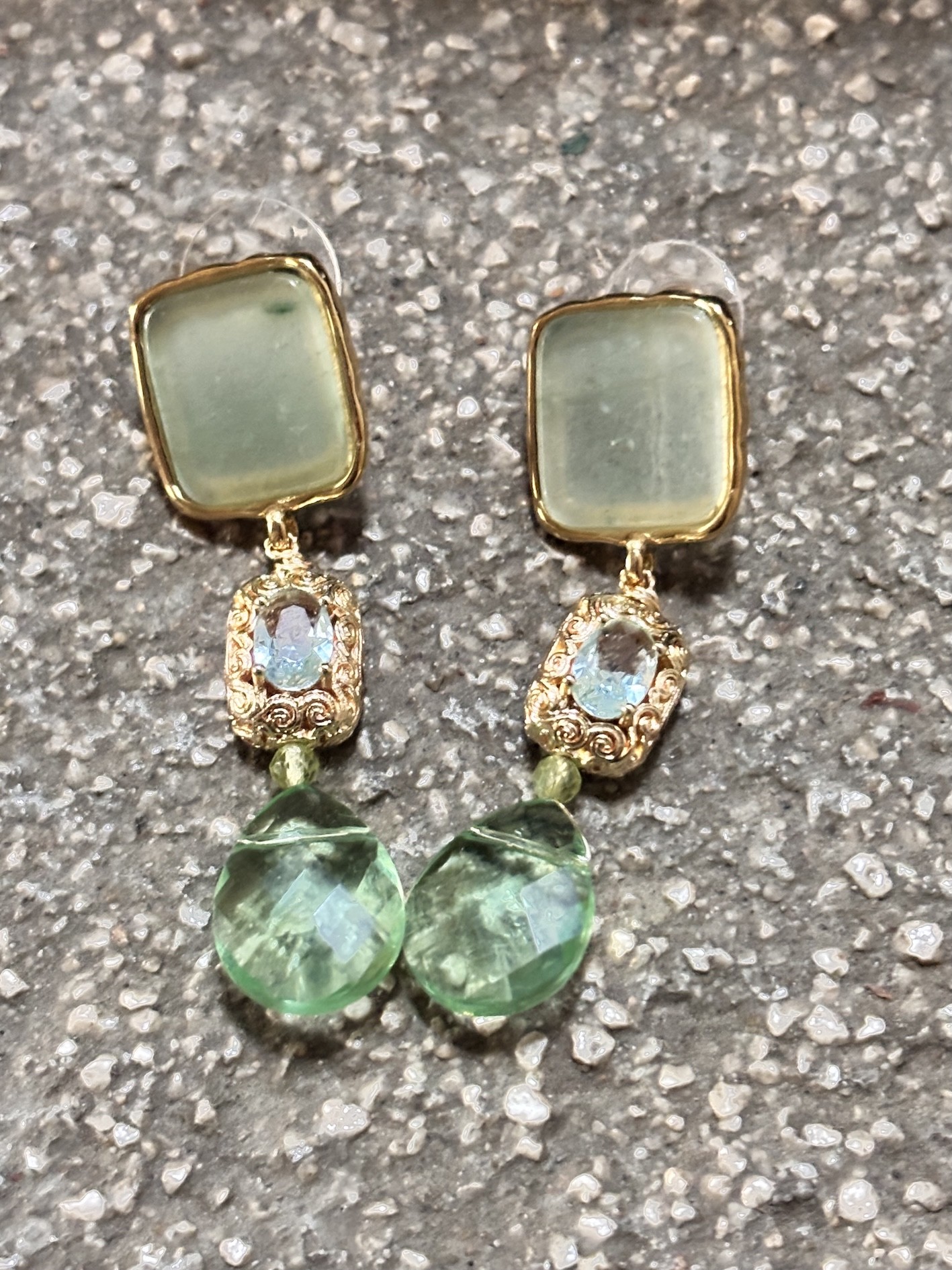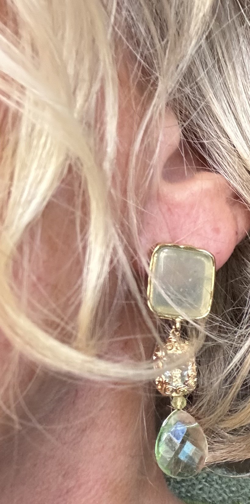 Le fermoir carré est une amazonite montée sur plaqué or 18k, douce et laiteuse comme une pierre d’eau.