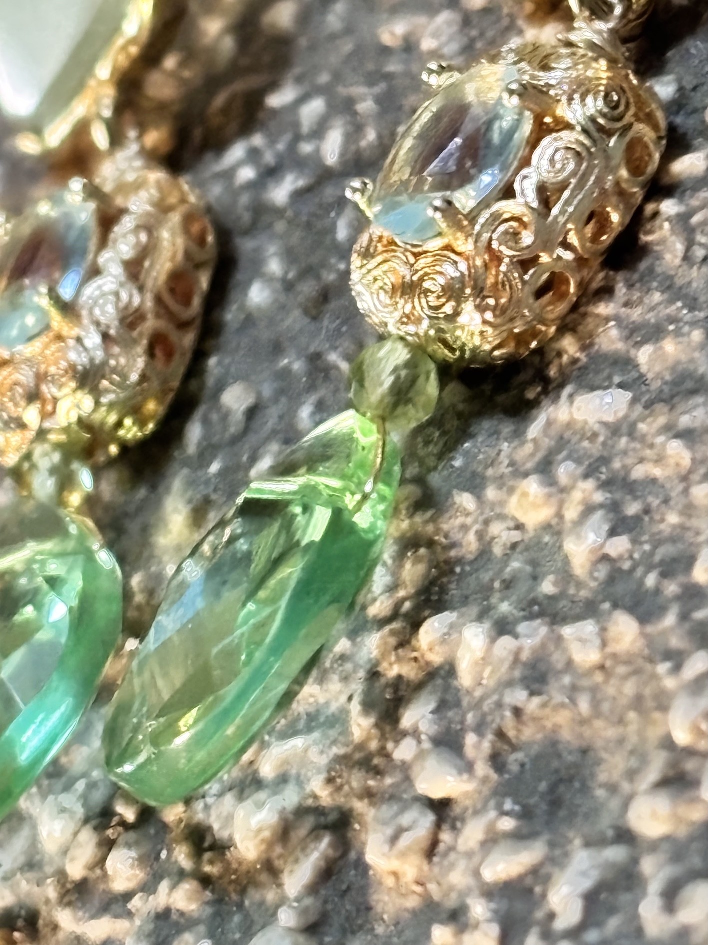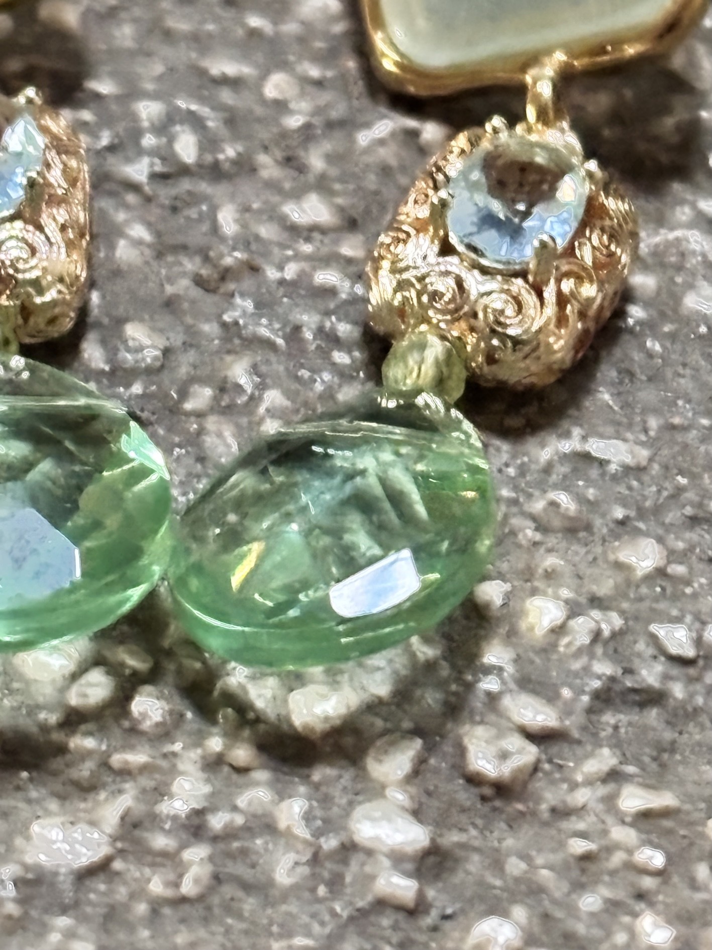 La création s’achève sur une goutte tchèque vert d’eau (provenance République Tchèque), accompagnée d’une petite perle vert pâle en zirconium de 3 mm.