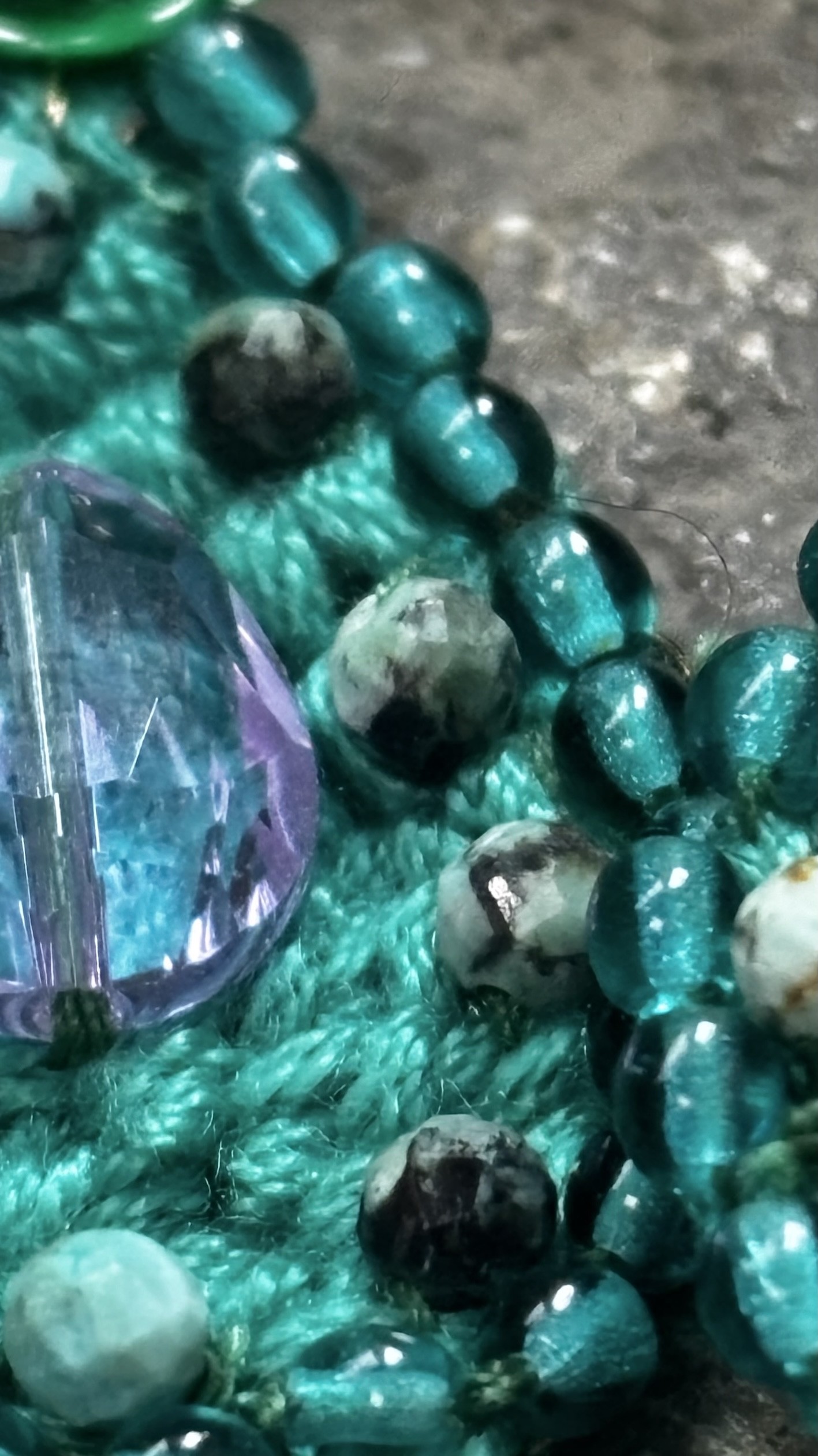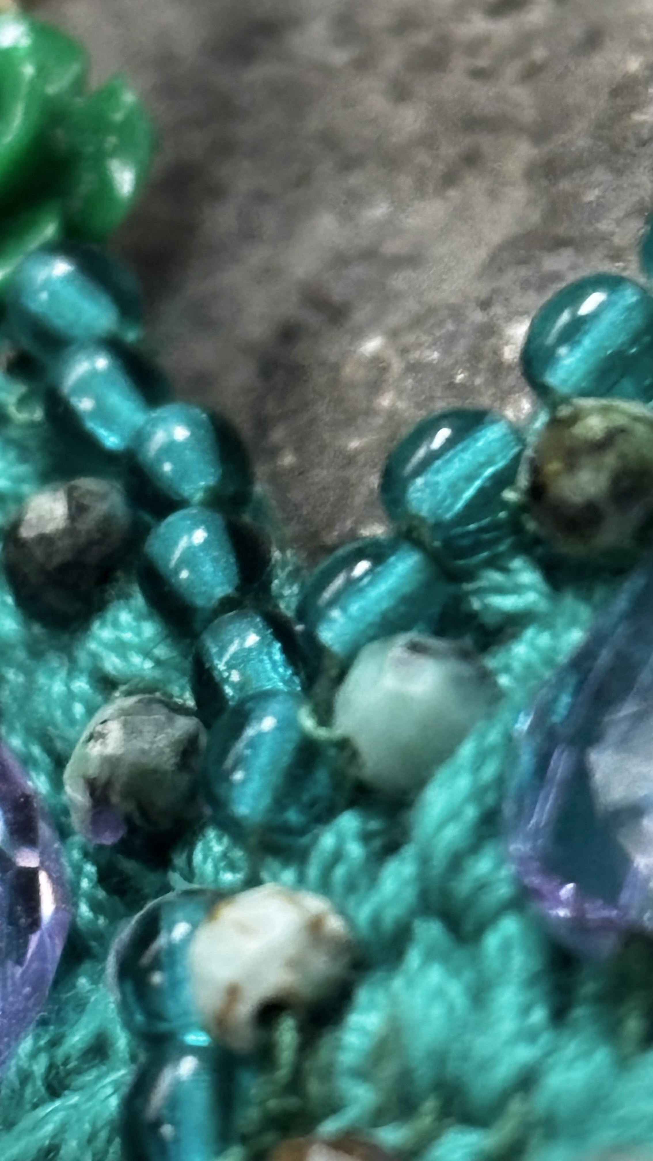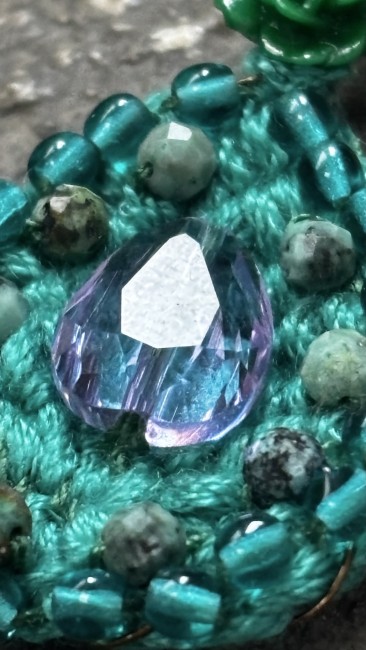 Les Larmes de Crocodile mêlent l’art du crochet et l’éclat des pierres pour une pièce lumineuse et pleine de caractère.