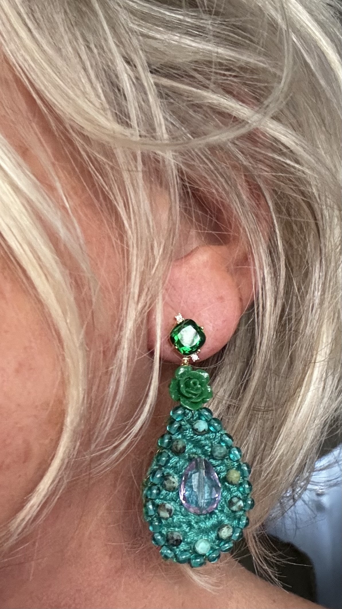 Chaque larme est crochetée à la main en coton, bordée de perles tchèques vert émeraude et remplie de perles de turquoise africaine. Au centre, un cristal facetté rose pâle apporte une touche de douceur scintillante.