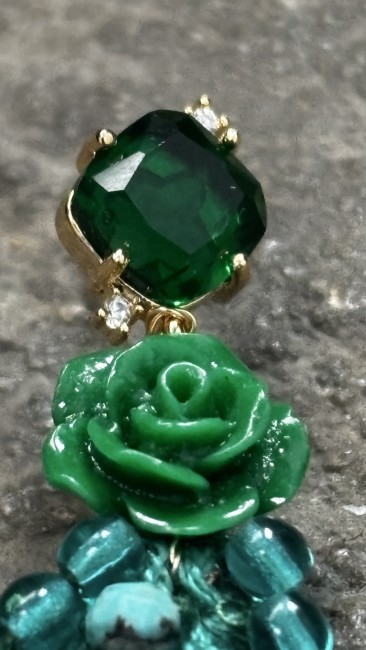 Le tout est sublimé par un fermoir plaqué or 18k orné d’un cristal vert facetté, surmonté d’une rose en résine verte, détail signature Cosca.