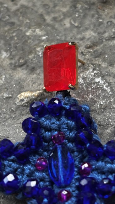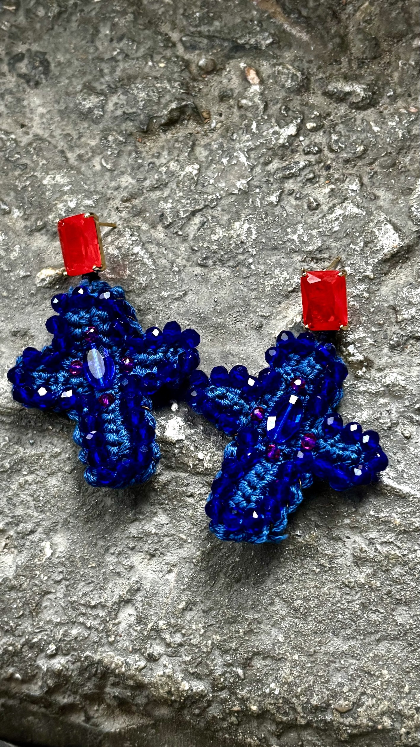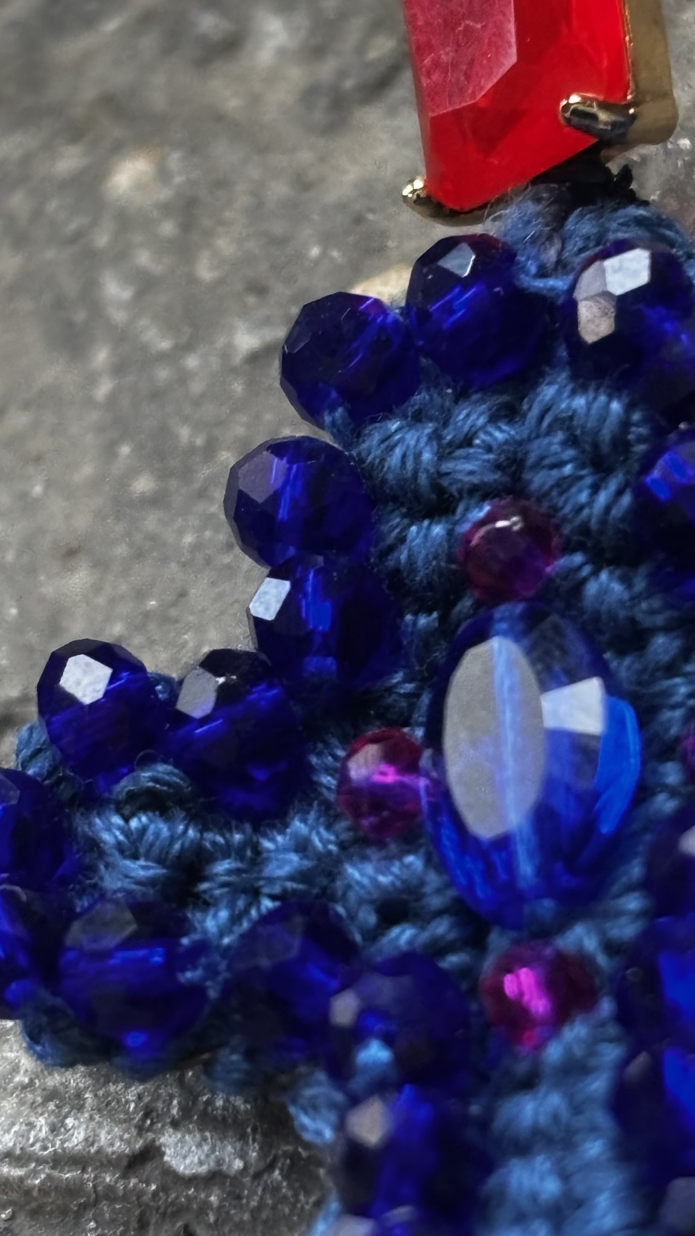 Blue Madonna, c’est l’esprit pop-sacré revu par Cosca : une croix au bleu profond, vibrante et lumineuse, entièrement crochetée à la main puis brodée de perles tchèques facettées.