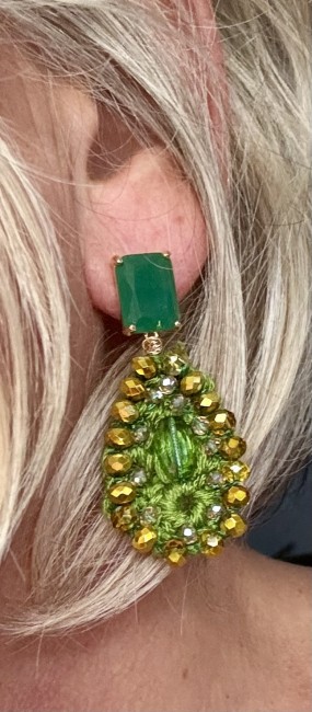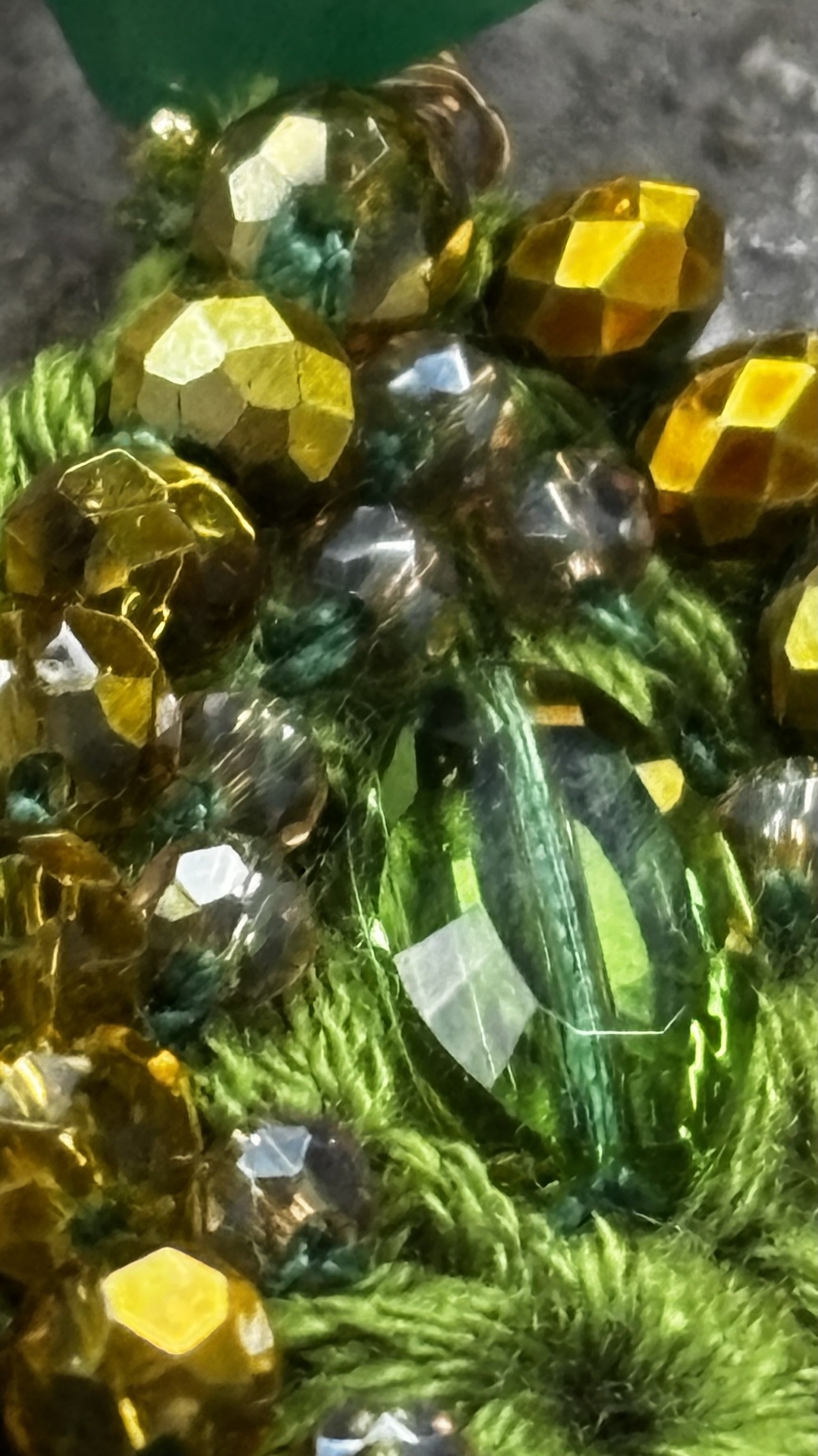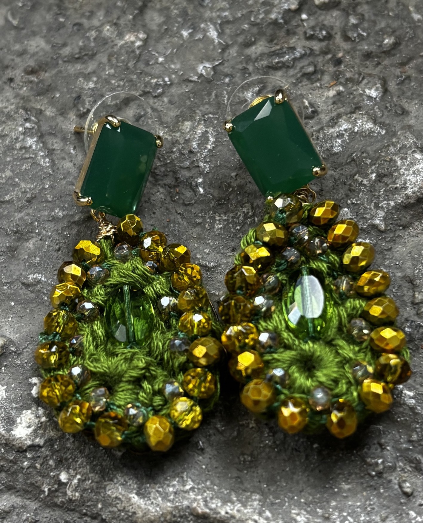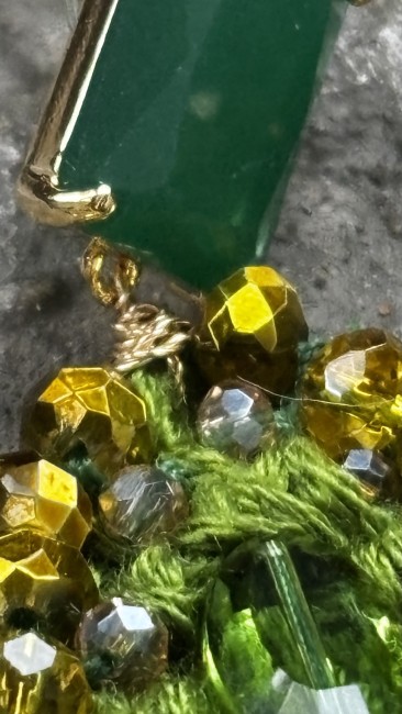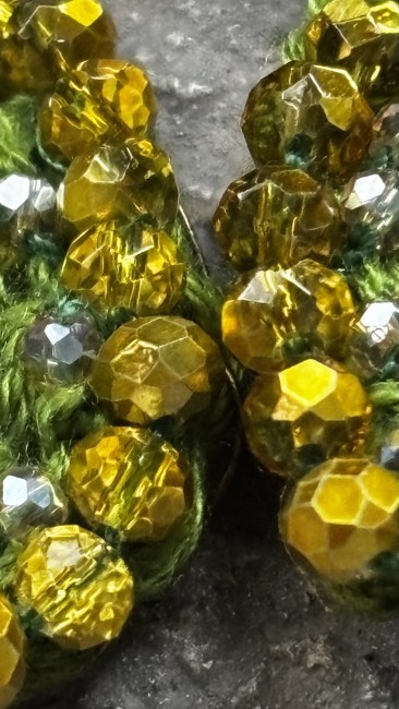 La goutte est crochetée à la main en olivine, puis entièrement bordée de perles tchèques facettées chauffées au chalumeau, d’où cette couleur dorée unique, impossible à nommer mais inoubliable.