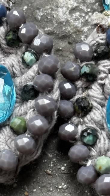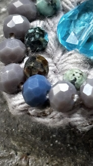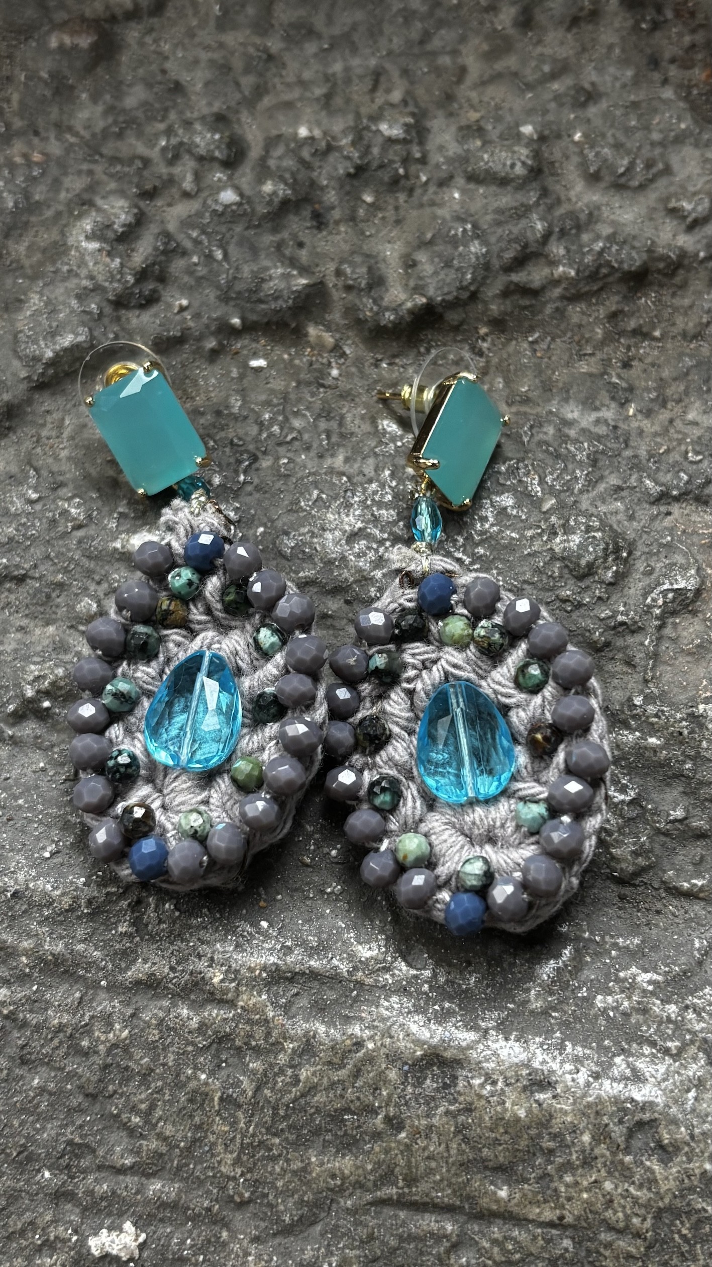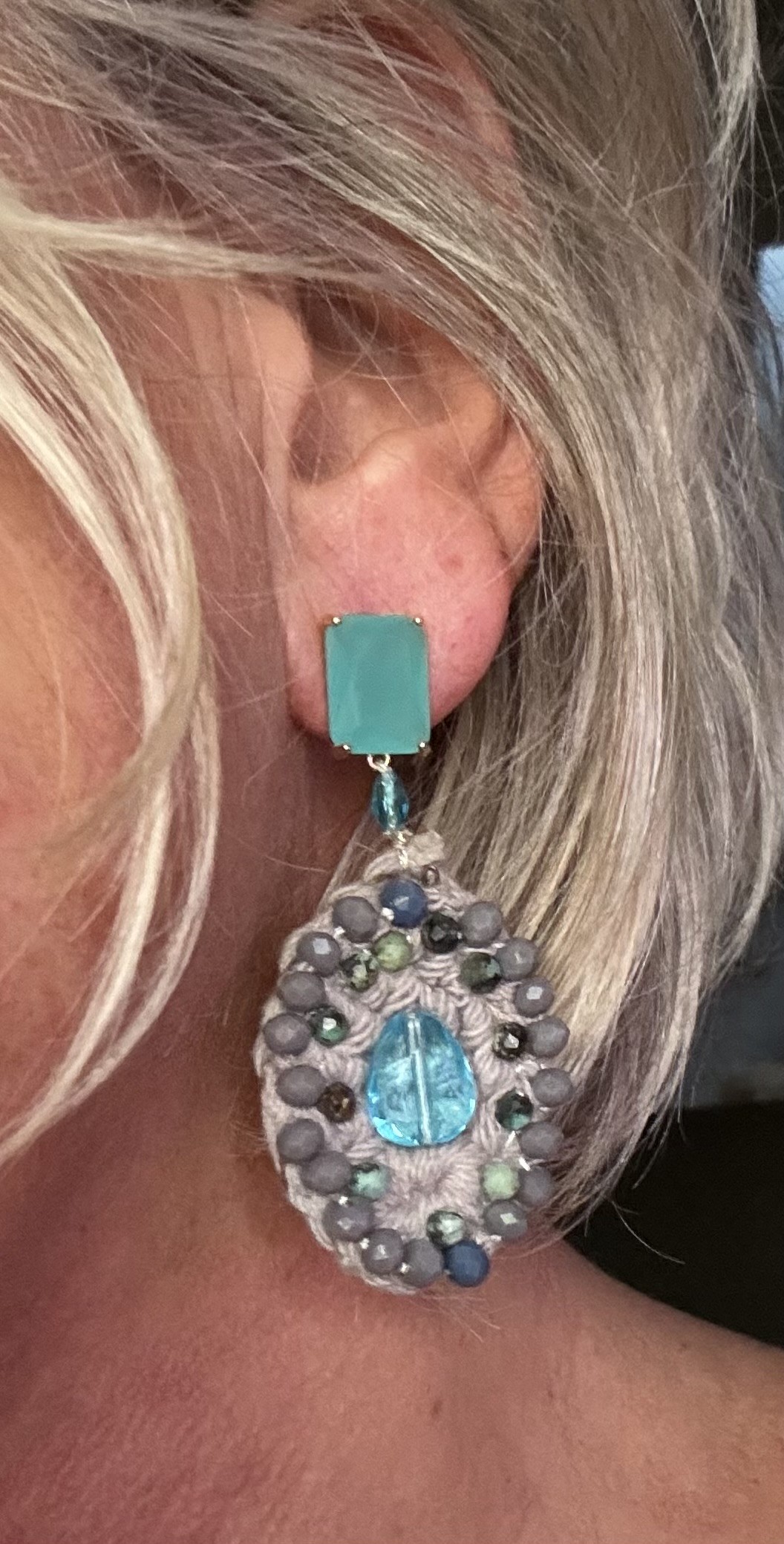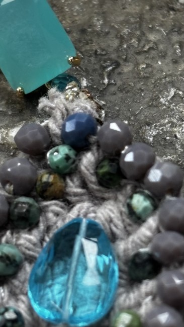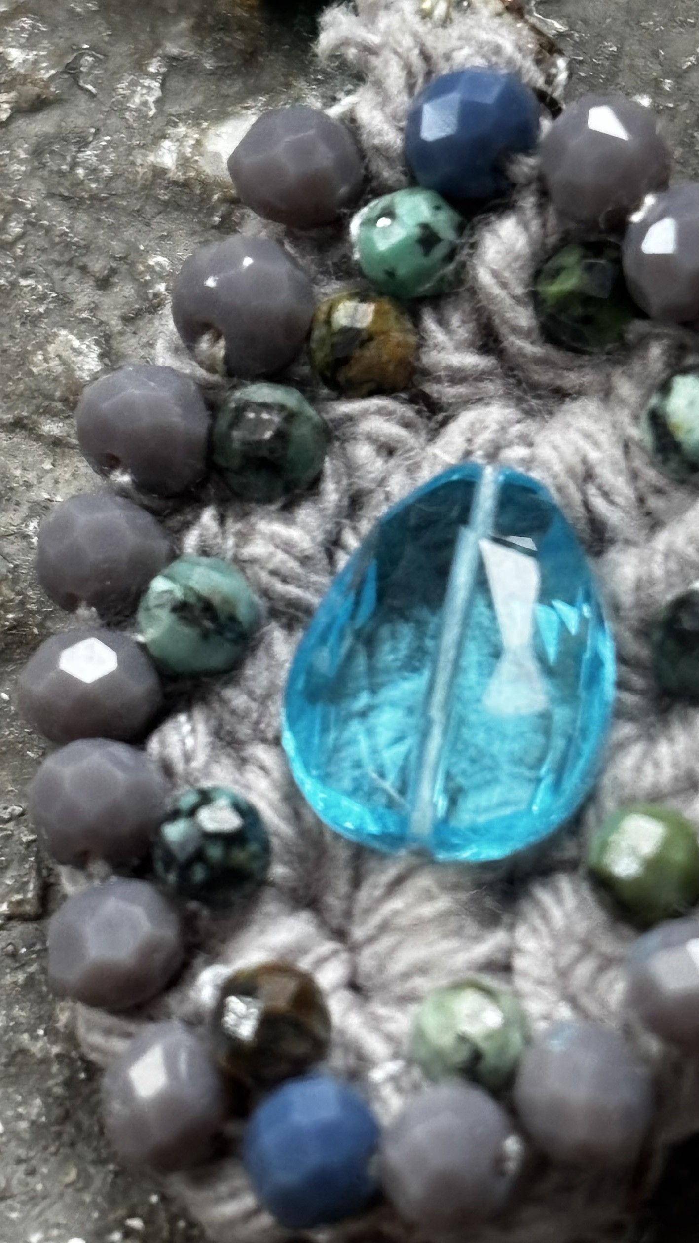 La goutte est crochetée à la main en beige, puis bordée de perles tchèques facettées taupe opaques, ponctuée de turquoises africaines pour un relief naturel et organique.