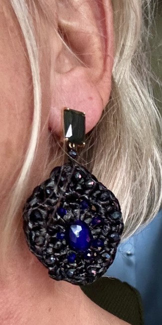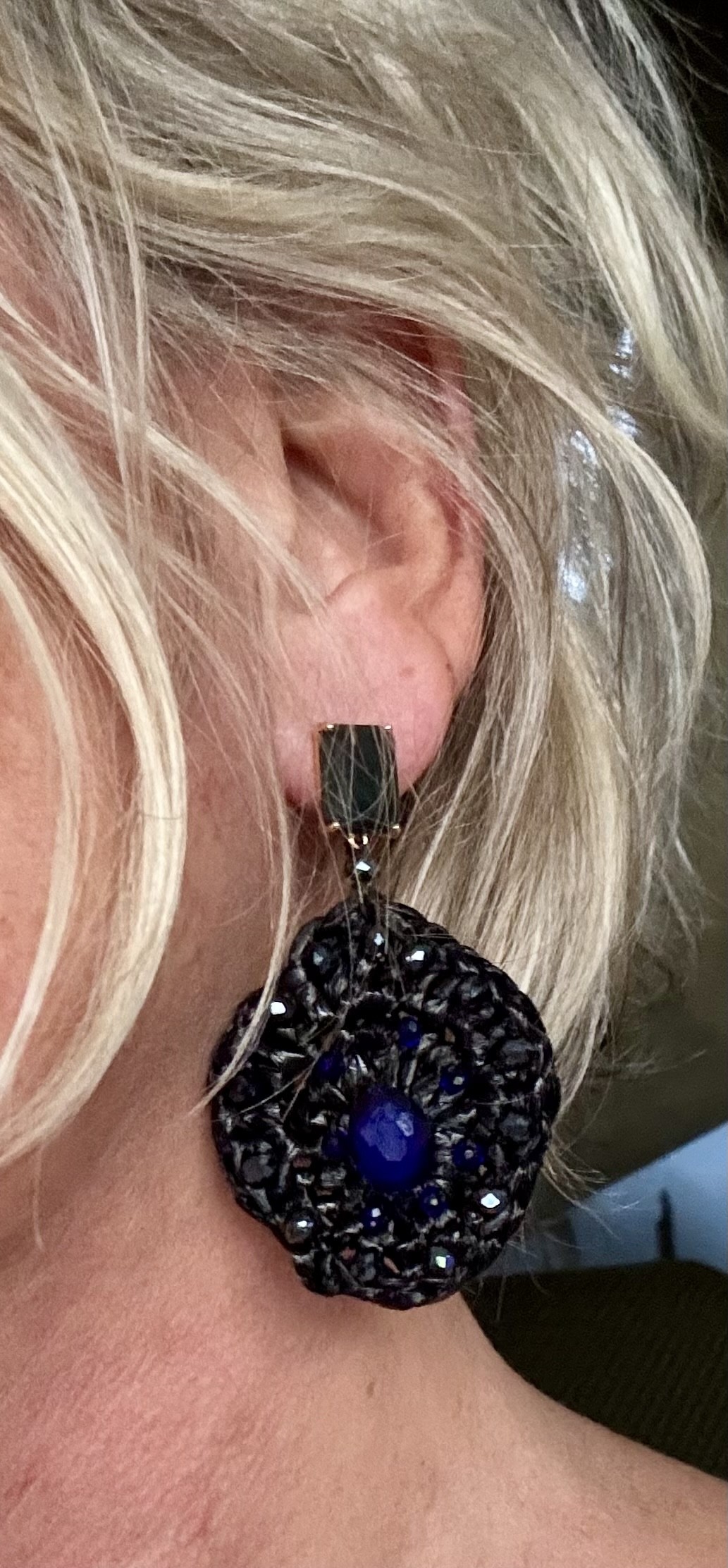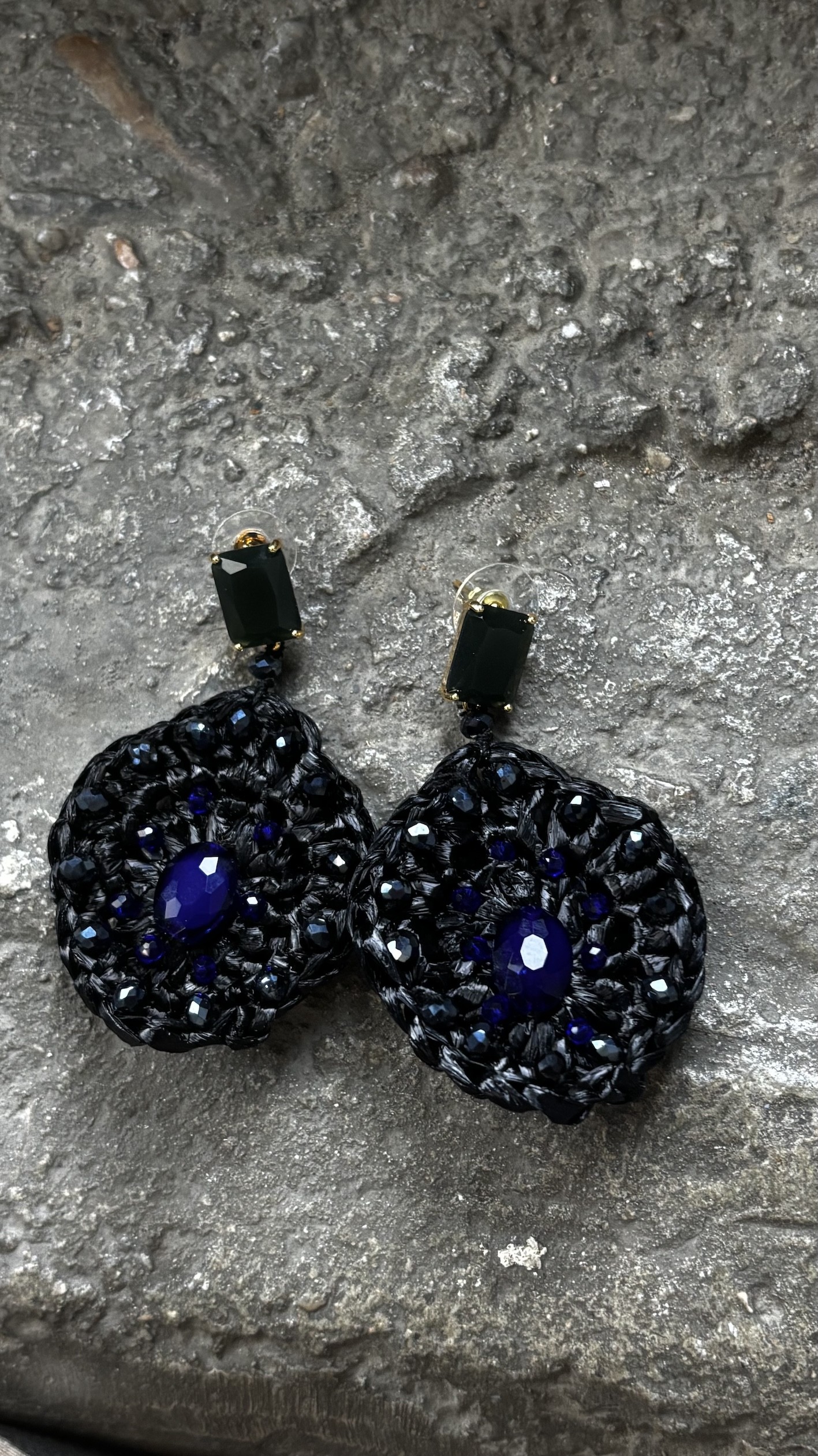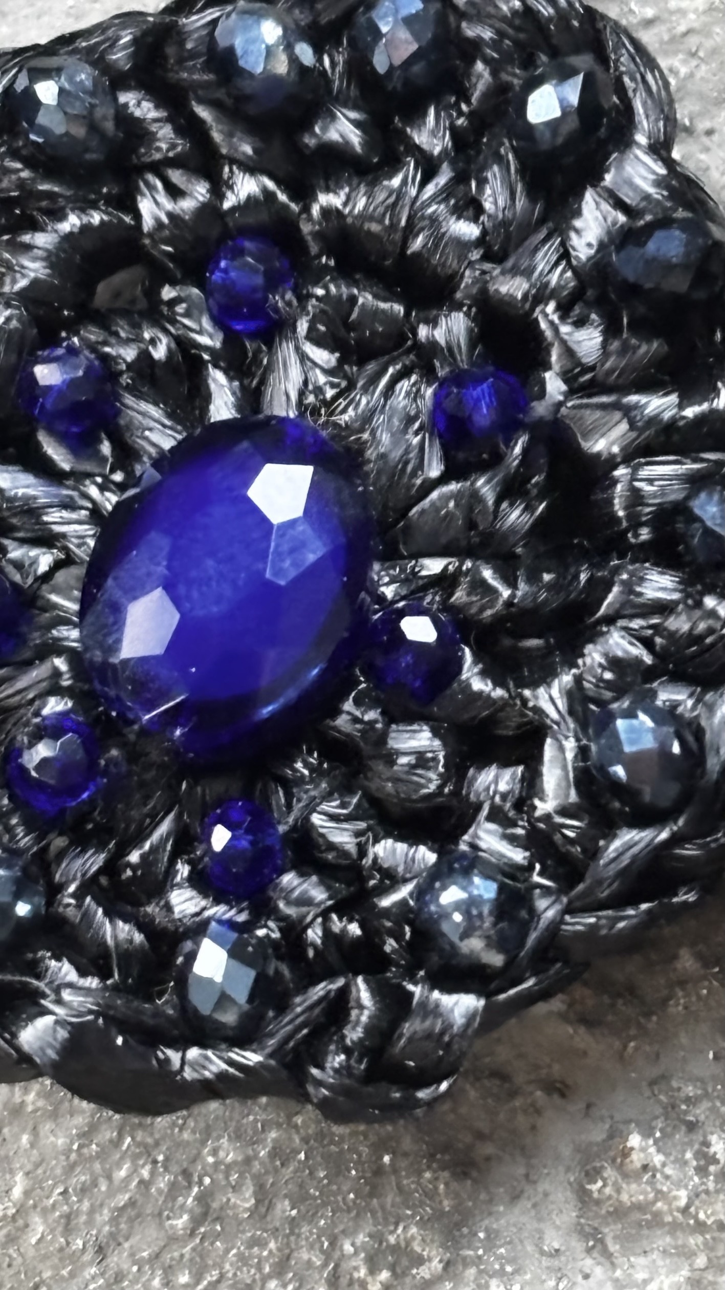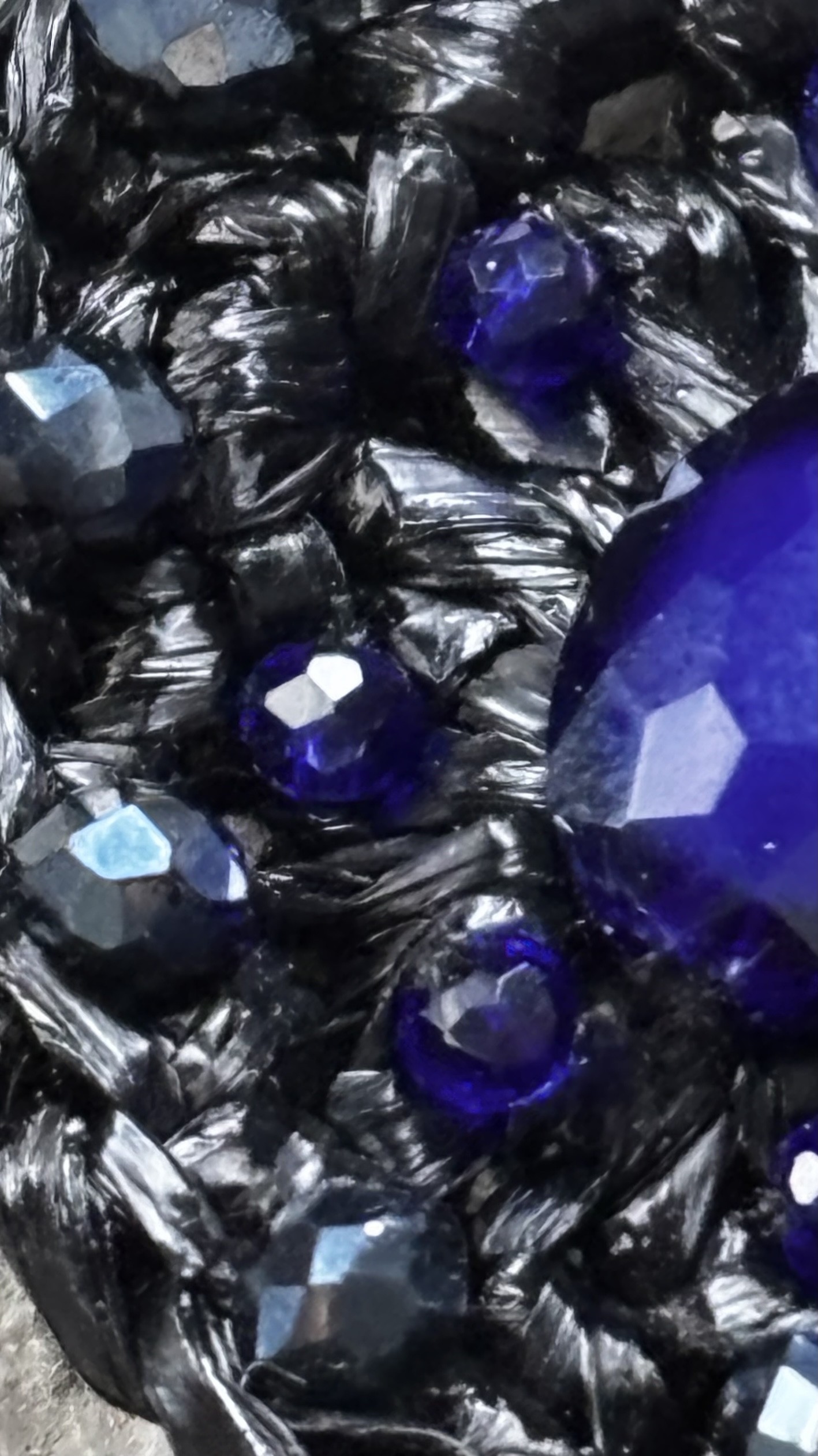 L’ovale est crocheté en raphia noir brillant, donnant cette texture cosmique unique, presque liquide. Il est serti d’un mélange de perles facettées noires et bleu indigo, qui brillent comme des éclats d’étoiles.